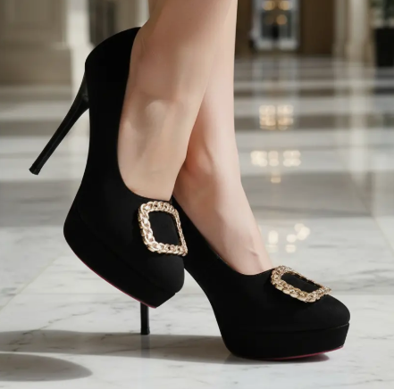 Diseño de adorno de cadena metálica retro: La punta del zapato lleva un adorno de cadena metálica tejida en forma de cuadrado, que añade un toque de elegancia vintage y eleva el lujo del diseño completo.Tacón fino de 10 cm con plataforma: El tacón de 10 cm combinado con una plataforma alarga notablemente las líneas de las piernas al mismo tiempo que alivia la presión en la planta del pie, equilibrando altura y comodidad al caminar.